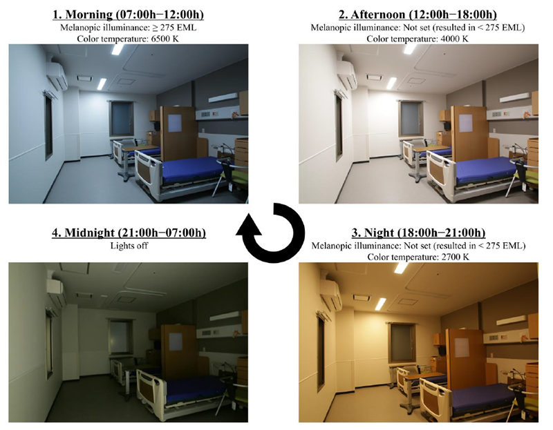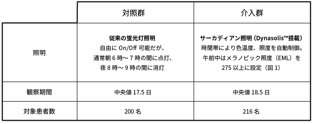 病棟において、概日リズム(サーカディアンリズム)2に配慮した照明環境を構築。色温度や明暗のサイクルを調整し、患者の睡眠リズムや覚醒状態を改善することで、転倒予防に効果があるかを検証。従来の蛍光灯照明下で入院した患者(対照群)とサーカディアン照明下で入院した患者(介入群)を比較。