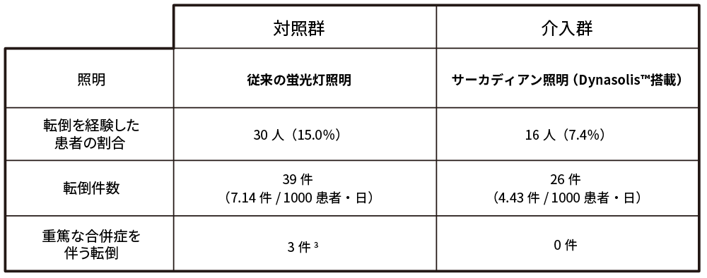 Dynasolis™ 搭載サーカディアン照明を用いた臨床研究にて、入院患者の転倒者数半減