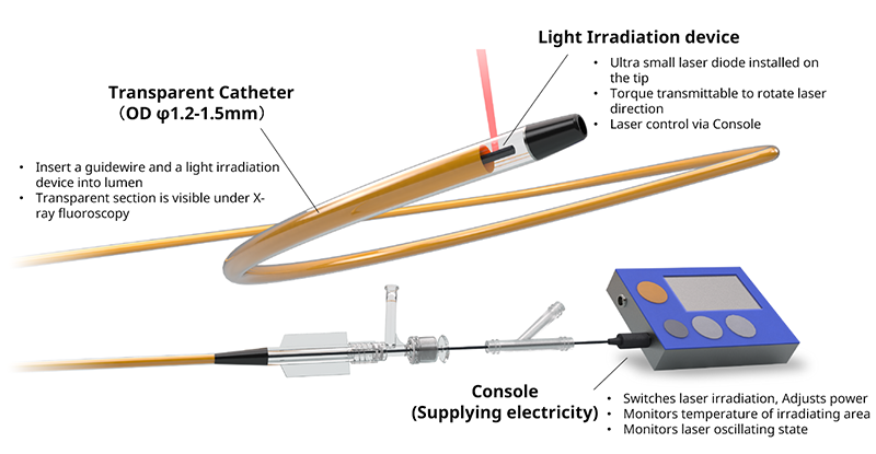 This joint initiative adds a new option, delivering light, to the conventional functions of catheters, such as burning, cutting, placing, measuring, suction, and drug delivery. By enabling deep-tissue light irradiation through blood vessels with minimal invasiveness, this approach can significantly reduce the physical burden on patients. Furthermore, because existing operating room equipment and physicians' techniques can be utilized as they are, smooth implementation in clinical settings is expected without requiring special infrastructure or operational changes.