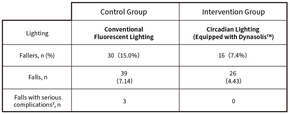 To address these issues, circadian lighting provides a physiologically appropriate light environment. In our clinical study, the introduction of circadian lighting into hospital rooms significantly reduced fall risk among inpatients by 44%. These results suggest that normalization of circadian rhythms through light intervention contributed to fall prevention by improving sleep disorders, delirium, and nocturnal frequent urination.