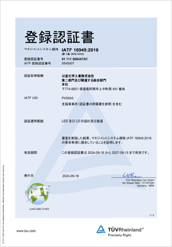 | Valid until | NICHIA CORPORATION domestic sites, Nichia America Corporation:August 2028 Nichia (Malaysia) Sdn.Bhd.:January 2027 |
