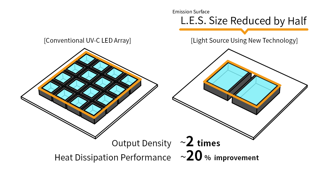 Nichia has been continuously developing various light sources with the aim of realizing a mercury-free society. As environmental conditions change, market needs and challenges also evolve, requiring technologies that can adapt accordingly. In particular, the replacement of mercury lamps demands light sources with high output, high output density, and excellent heat dissipation. Nichia is one of the very few manufacturers engaged in both lasers diodes (LDs) and LEDs. By applying the high heat dissipation packaging technology cultivated through projector-use LDs over many years and combining it with high-power UV-C LED chips, Nichia has transformed its unique concept into reality and established a new light source technology. As a result, output density has doubled compared to conventional models, and heat dissipation performance has improved by approximately 20%.
