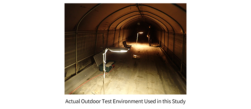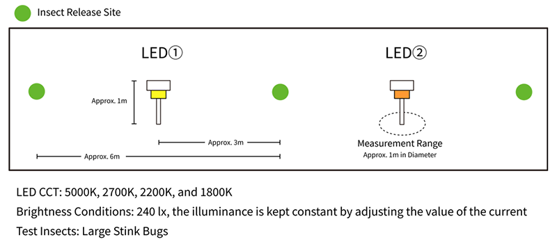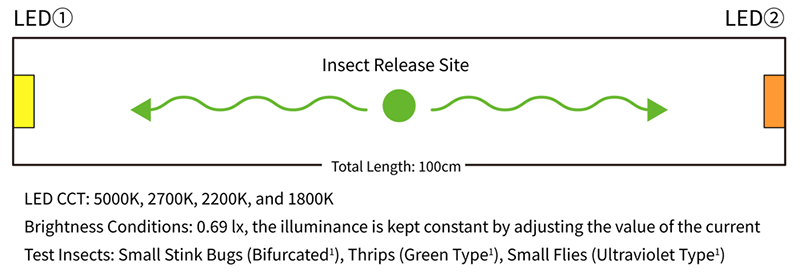 In the test, LED ① and LED ② were installed at opposite ends of a linear test space with a total length of 100 cm, and test insects were released from a central release point. By observing and recording which LED direction the insects moved toward and were attracted to, the relative insect attraction of LEDs with different CCTs was evaluated and compared.